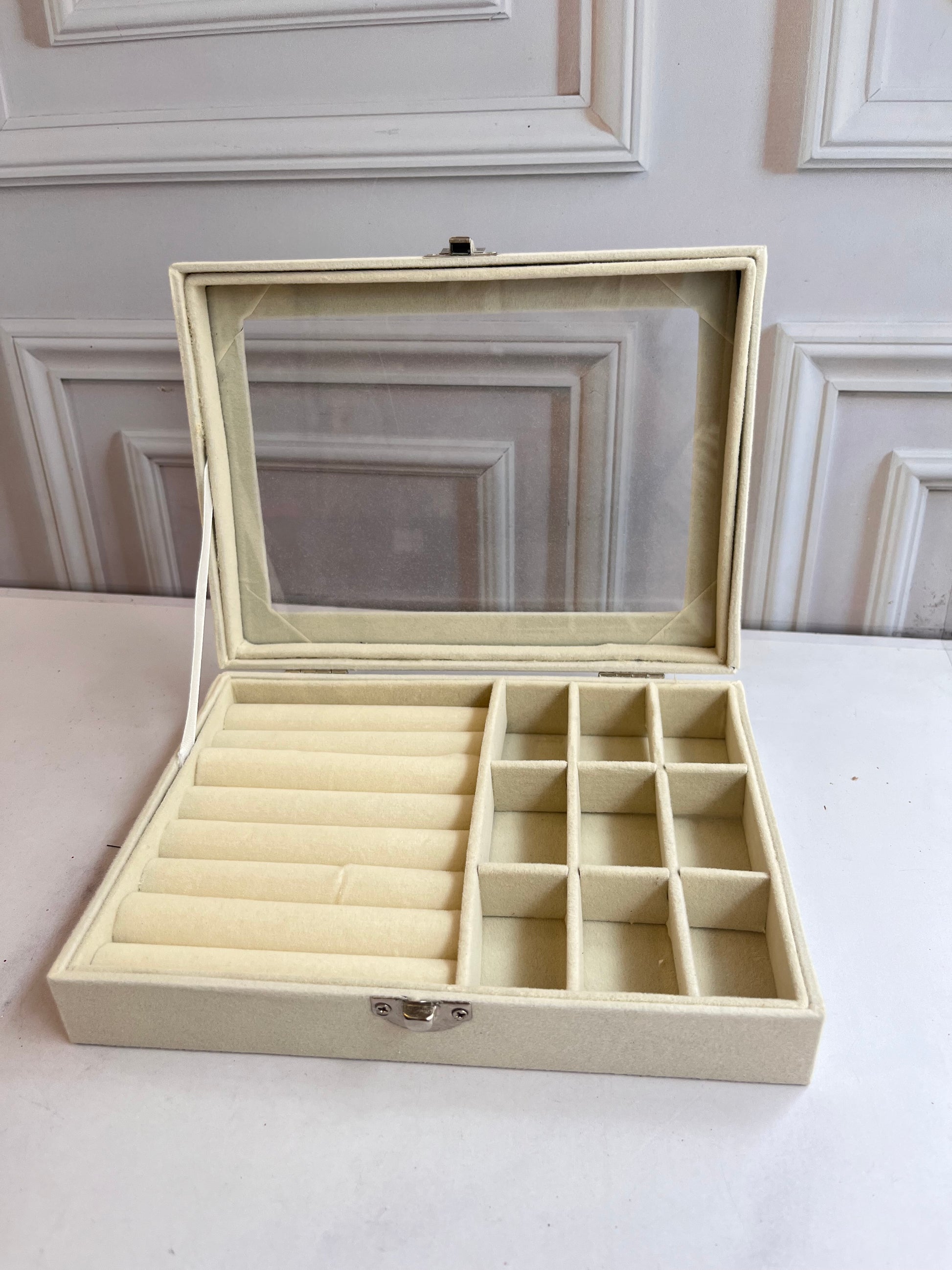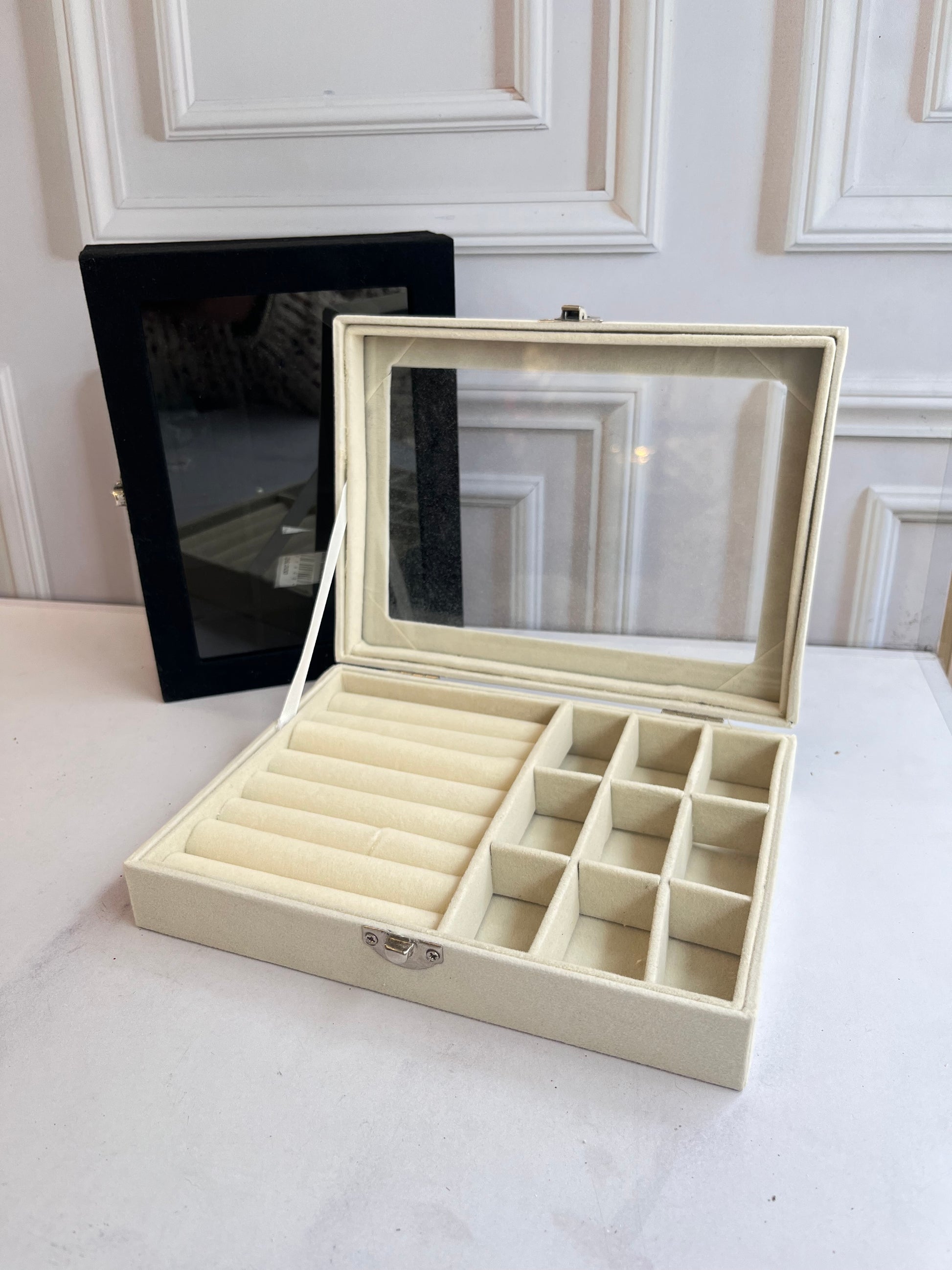 Elegante y funcional joyero con acabado aterciopelado. Su tapa transparente permite visualizar fácilmente el contenido sin necesidad de abrirla, ideal para mantener tus accesorios organizados y protegidos.